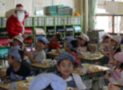 給食の時間に合わせてサンタさんとトナカイさん4頭が現れ、よい子のみんなにカップデザートババロアをプレゼントしました。