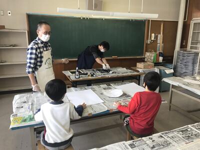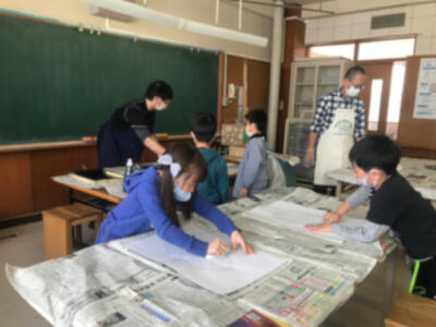 担任の先生が子どもたちの作った版に黒インクをつけたあと、子どもたちは、和紙をこすりました。