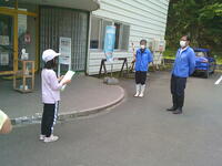 今にも雨が落ちてきそうなあいにくの曇り空の中ではありますが、本日より学校が再開しました。玄関で出迎える先生方に「おはようございます」「Good Morning!(ALTのマイケル先生には、みんな英語で挨拶しています!)」と、元気いっぱいのあいさつで久しぶりの再開を喜んでいるように見えました。