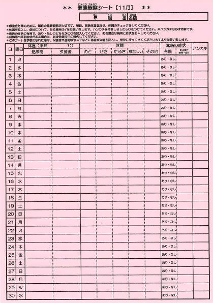 こちらのシートに検温の記入をしていただき、登校時に子供に持たせてください