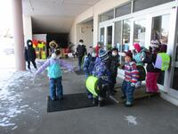 先日の雪の関係で、校門から児童玄関前周辺が氷のために足下が危険だったために、声をかけながら出迎えました。