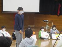 校長先生の話のあと、児童会会長の話、1、3、5年生の各クラスの代表児童へのインタビューがありました。