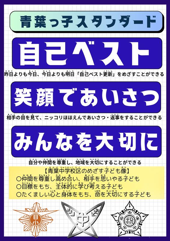 青葉中学校区(青葉中・日の出小・祝梅小)において、9年間で育む「目指す子供像」をまとめたものです。