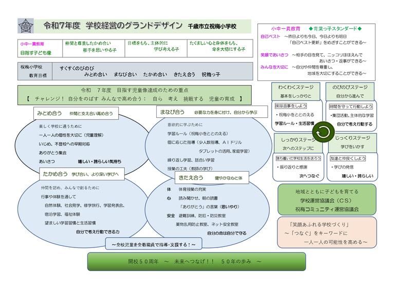 【グランドデザイン】 本校の教育全体を見通せる「グランドデザイン」を一新しました。 学校教育目標に向けて、令和7年度の学校経営方針と重点、そして具体的にどのような教育活動が行われるかがわかるようになっています。 |