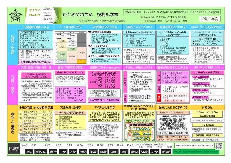 学校基本ガイド【ひとめでわかる祝梅小】 本校が行っている教育活動の概要がわかる一枚です。具体的な取組や特色ある活動など本校の特徴がわかるものになっています。 |