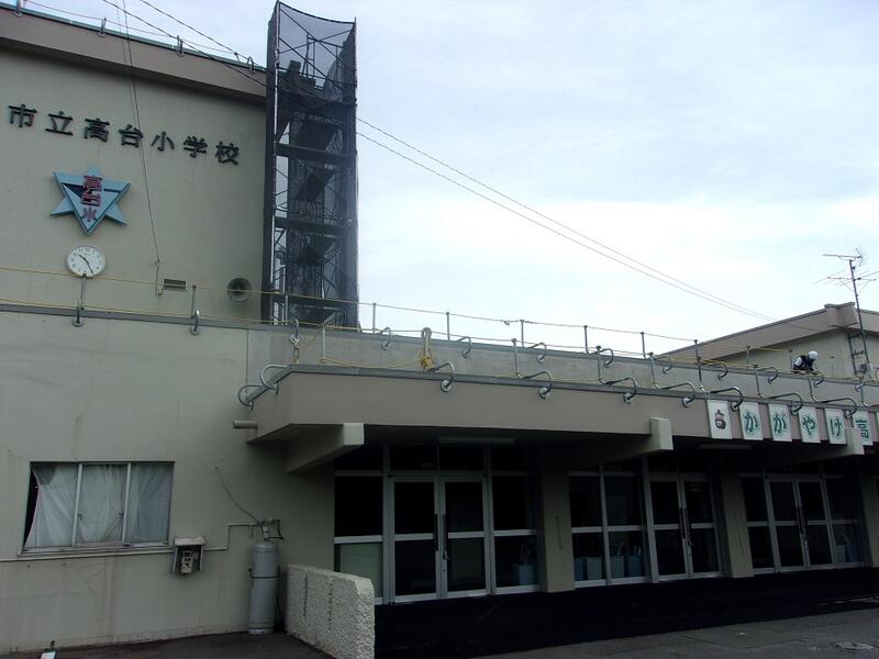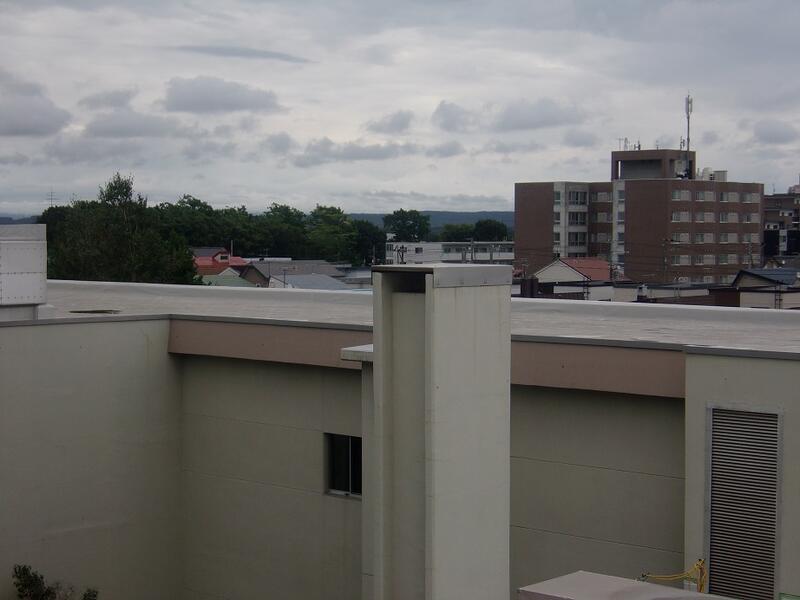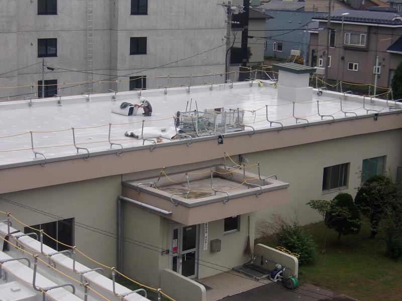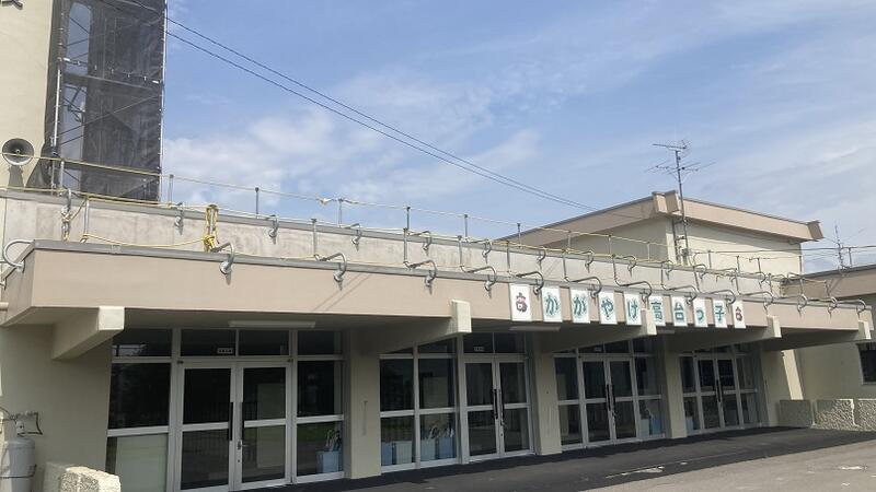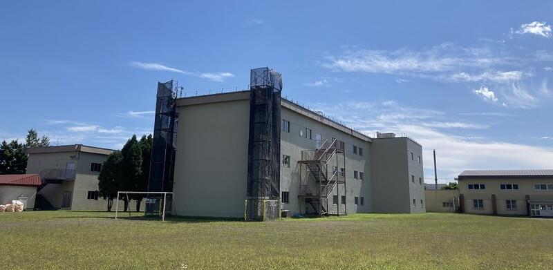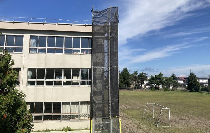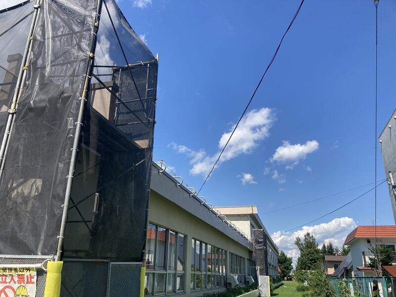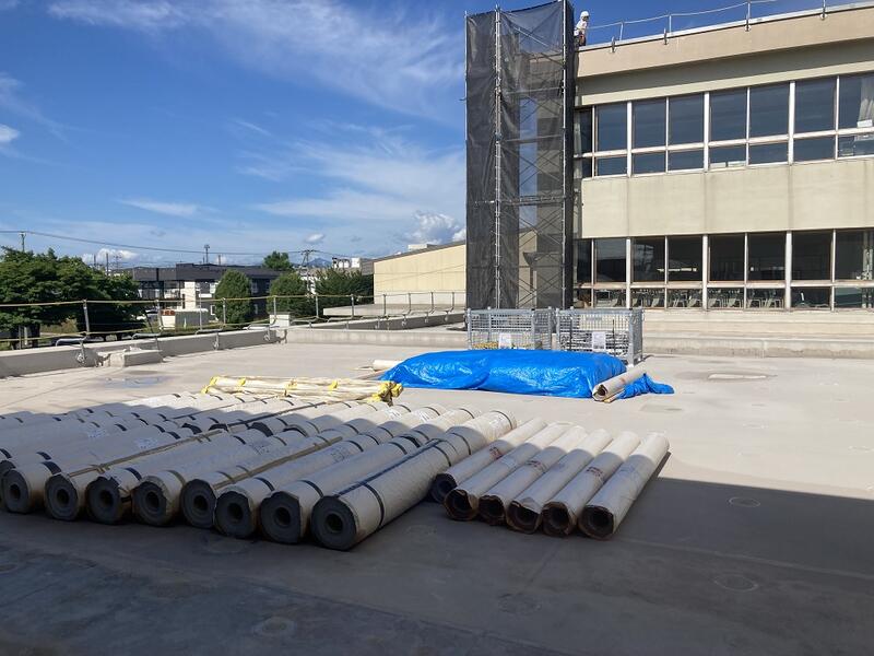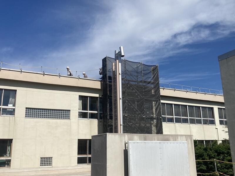 校舎屋上の防水シートの張替え工事の様子です。数か所で足場を組み、作業が進められています。計画通りに作業が進めば今月までに工事が終了する予定です。