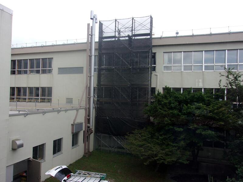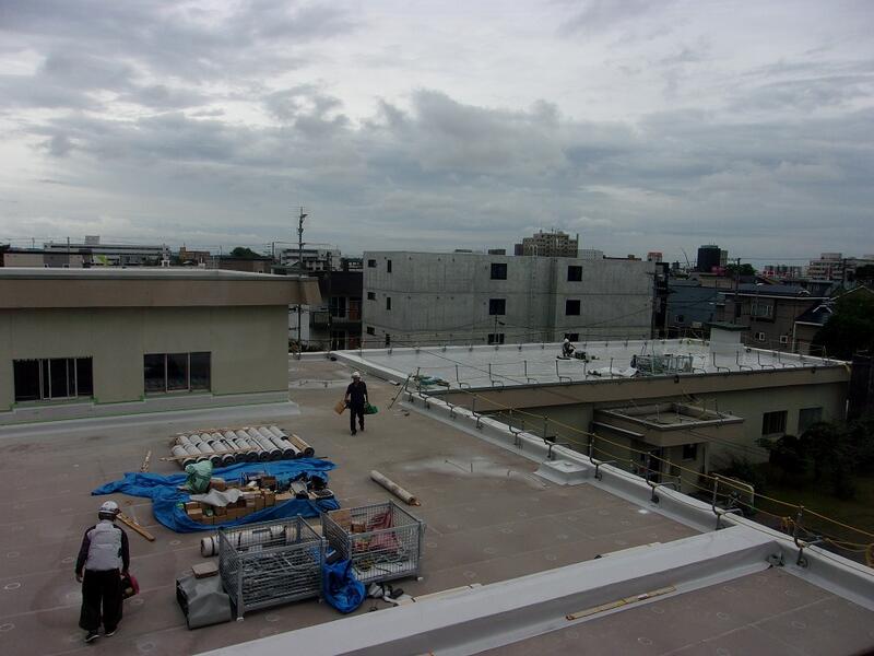 校舎屋上の防水シートの張替え工事の様子です。大きな足場の箇所が増え、細かな支柱が設置されています。暑い中が続きますが、工事が進められています。
