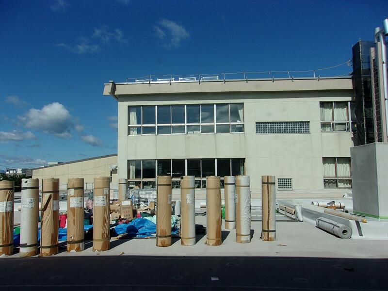 校舎屋上の防水シートの貼り替え工事の様子です。各校舎の屋上に新しいシートが貼られています。作業が終盤に入り、シートを貼る箇所が職員室棟の屋上のみとなりました。