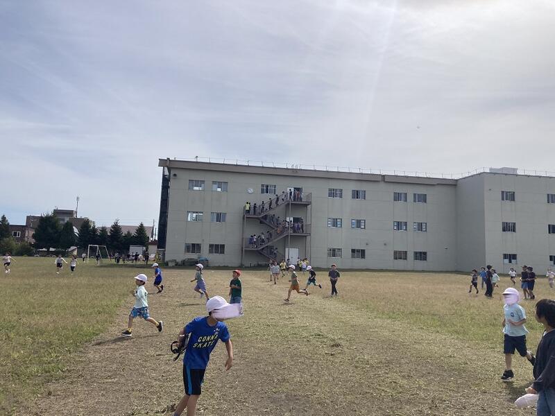 今回は地震を想定し、予告をせず休み時間に行いました。緊急放送後、放送の指示に沿って、真剣に避難することができました。また、7年前の9月6日に発生した胆振東部地震についてのお話があり、改めて「地震はいつ、どこでも起きる」ことを学びました。