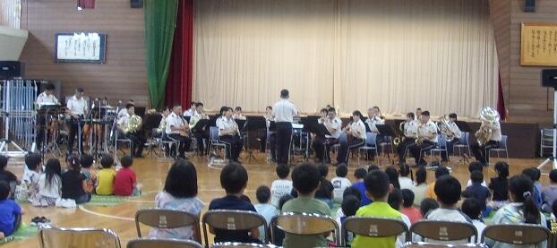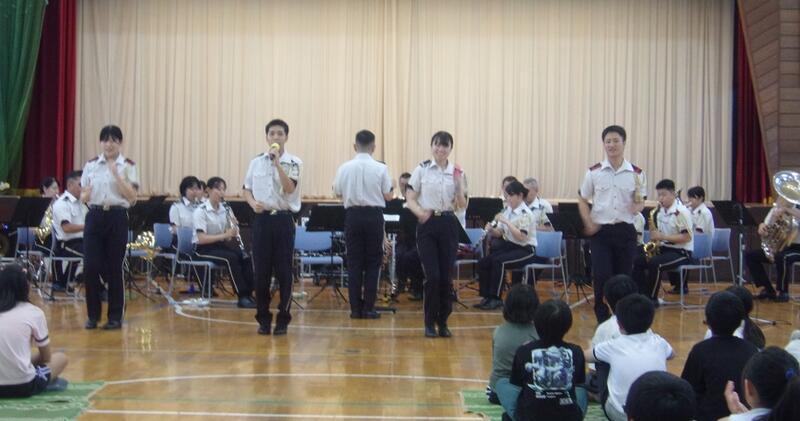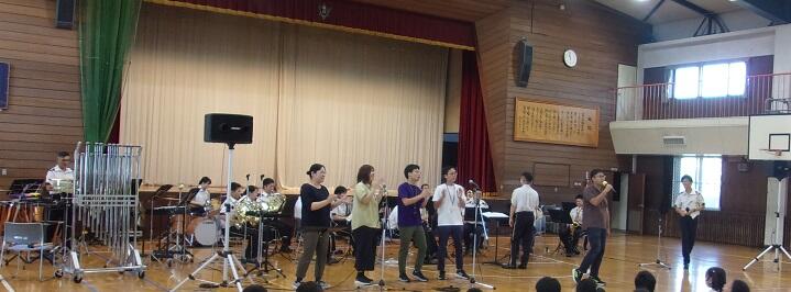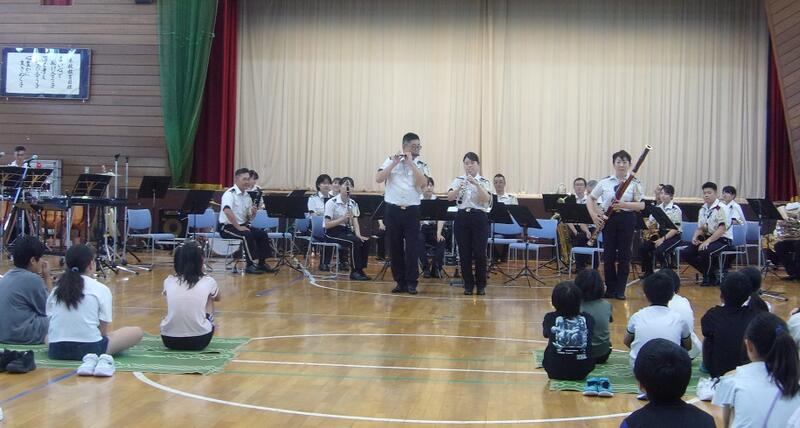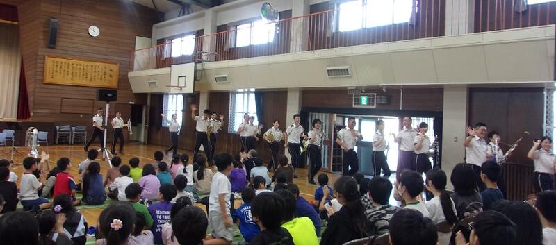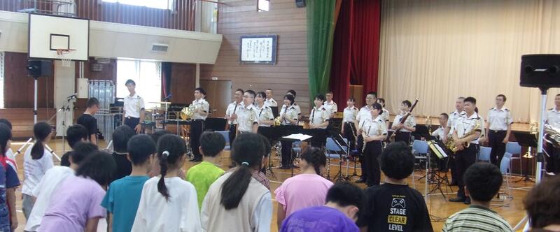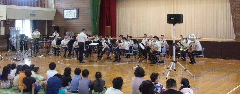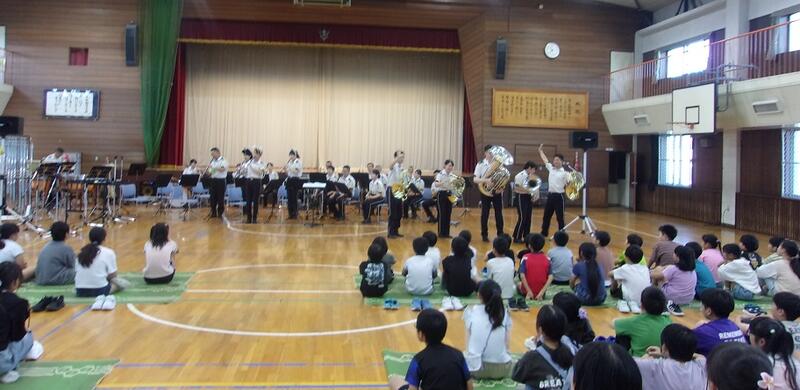 陸上自衛隊の第7音楽隊の方々による音楽鑑賞会を開催しました。ディズニーソングから始まり、演奏中は子どもたちの心をひきつけ、真剣なまなざしで聴いていました。楽器の紹介や高台小学校バージョン曲当てクイズと続き、先生たちもオーケストラの生演奏をバックに熱唱する場面がありました。あっという間に時間が過ぎ、きれいな音色と迫力ある演奏は子どもたちの心に響く鑑賞会となりました。