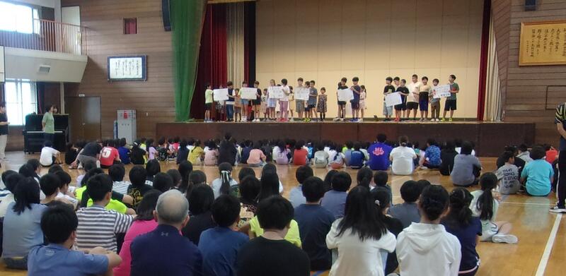 前期の終業式を行いました。はじめに校長より、ノーベル賞を受賞された方々のように目標やめあてをもってねばり強く取り組むことが大切であり、お家の人と一緒に通知表を見て後期の目標やめあてを持ちましょうとのお話がありました。その後、児童を代表して1年生、3年生、5年生の児童が前期をふり返る作文を発表しました。食生活を見直し休まずに学校に登校したことや、運動会や宿泊行事を成功するように努力したこと、漢字がすらすら書けるようになった、理科の実験が正しくできた等、また、学習発表会や委員会の活動、フレフェスの行事をがんばりたい等、後期の抱負を述べていました。