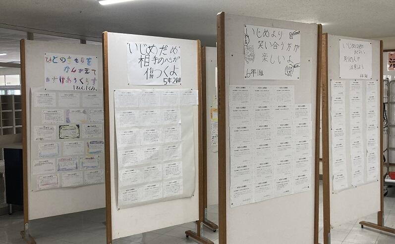 全校の児童でいじめのない学校を目指して『NO!いじめ集会』を行いました。事前に各クラスでは、いじめについて考え、いじめをなくすための標語を作りました。その標語を発表し合いました。その後、児童会書記局と学級代表が絵本の『となりの席のますだくん』の読み聞かせを行いました。全校児童でいじめについて考えを深める大切な時間となりました。児童一人一人の感想が掲示されています。