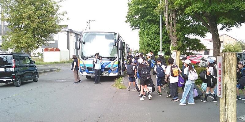 5年生が登別市、白老町方面へ宿泊学習に出かけました。出発前時の結団式、当日の出発式の様子です。1日目はネイチャーウオークラリーや川中を歩くリバートレッキング、2日目は白老町へ移動し、ウポポイへ行きアイヌの学習に取り組む予定です。⇘