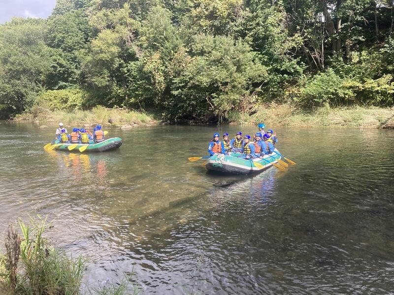 リバートレッキングでは、歓声を上げながら、水の中を歩いたり、泳いだり浮いたりしながら、楽しみながら川の水に親しむことができました。天候の影響でナイトハイクは中止となりましたが、室内でネイチャーゲームと生物講座を行いました。2日目は白老町のウポポイで事前に設定しためあてや学習課題の解決のため、班ごとに学習を進めました。午後からは、アイヌの伝統芸能を鑑賞し、さらに学習を深めることができました。