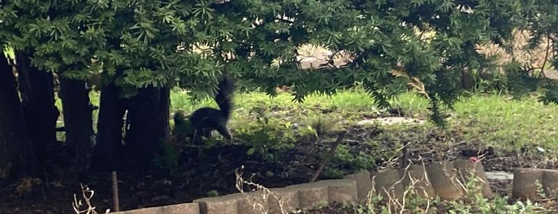 子どもたちが登校する前、学校の前庭にリスがいました。エサを求めて校地内に入り、まわりを気にしながらイチイの木の下にあったエサを食べていました。5、6分の出来事でしたが、こころが癒される時間でした。