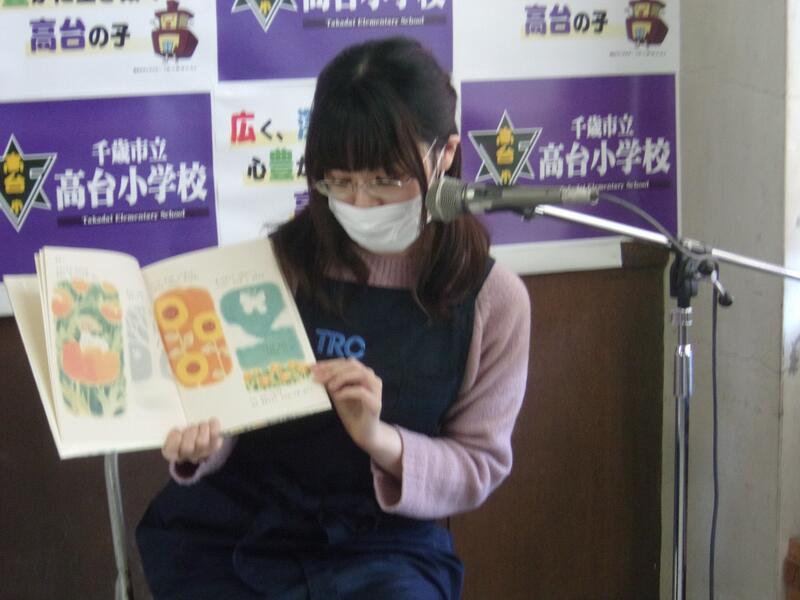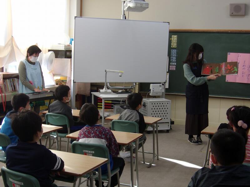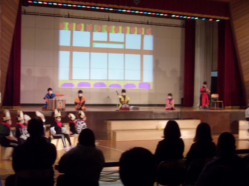 本日、ひだまり学級で、節分をテーマにした催し物を実施しました。その一つ。図書館司書の綾部さんと、図書ボランティアの篠原さんが、演奏に合わせて読み聞かせを行いました。題名は「おにはそと」。読み終わった時に、何度も「もう、終わったの?」というつぶやきがもれるほど、子供たちは夢中になって聞き入っていました。