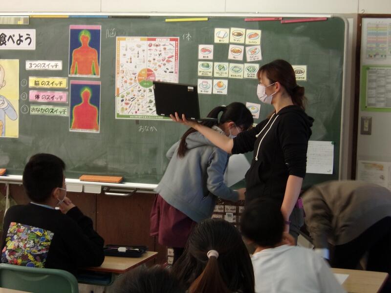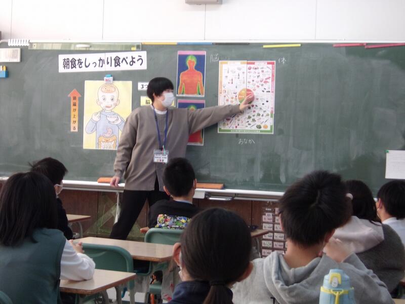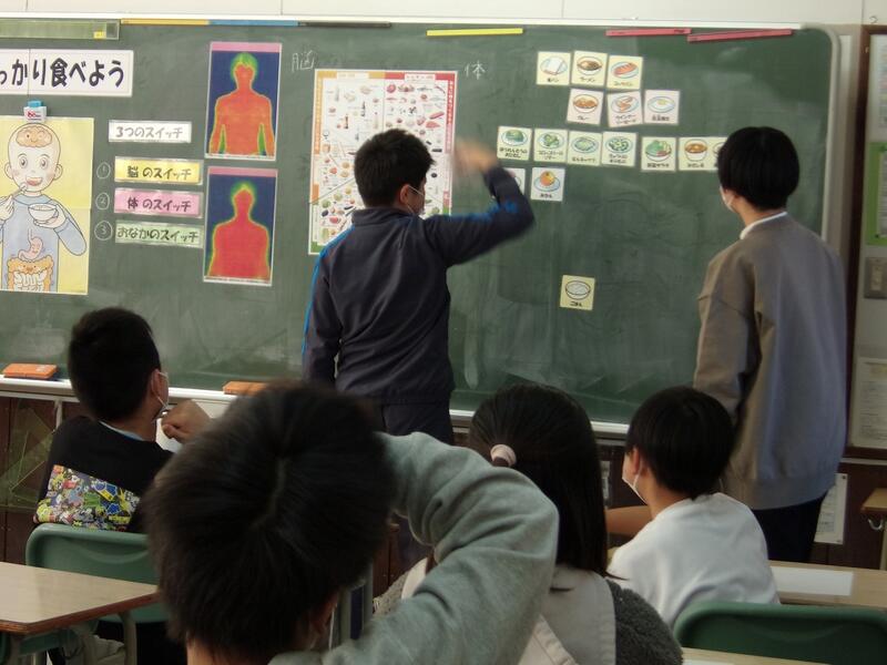 6年生が栄養教諭による「食に関する指導」を受けました。朝食を食べることで体温が上がり、「脳」「体」「おなか」の3つのスイッチも入れて1日元気に過ごすことができるということを教えてもらいました。食べ物の3つの働きについてもしっかり学んだ後、自分たちで栄養バランスを意識した朝食の献立を考えました。