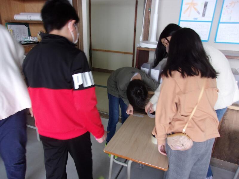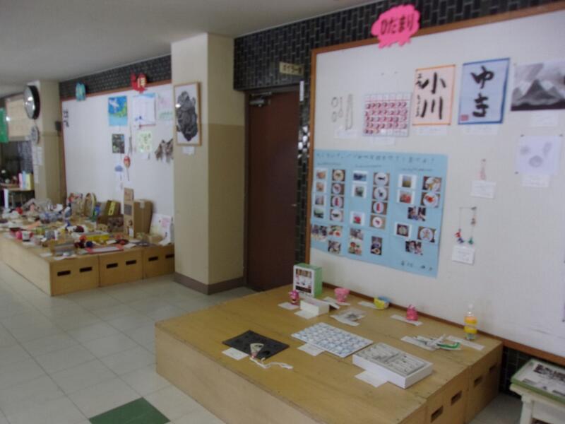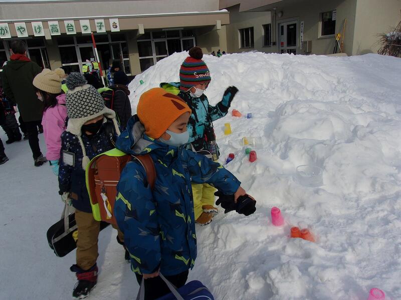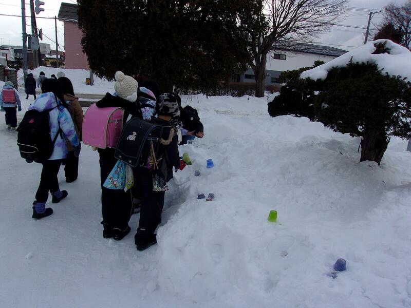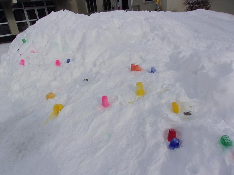 図工で作った色水を凍らせて、1年生が氷の飾りを玄関前通路に設置しました。1年生も上級生も、興味を持って眺めながら下校していました。