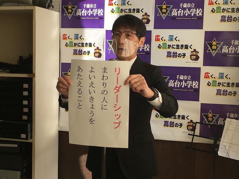校長からは、『リーダーとリーダーシップ』の説明がありました。リーダーだけではなく、高台小学校全員でリーダーシップを発揮して、幸せいっぱい、笑顔いっぱい、成長いっぱいの高台小学校にしていきます。