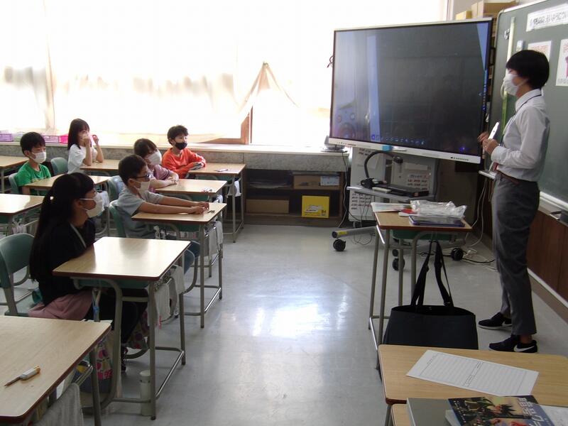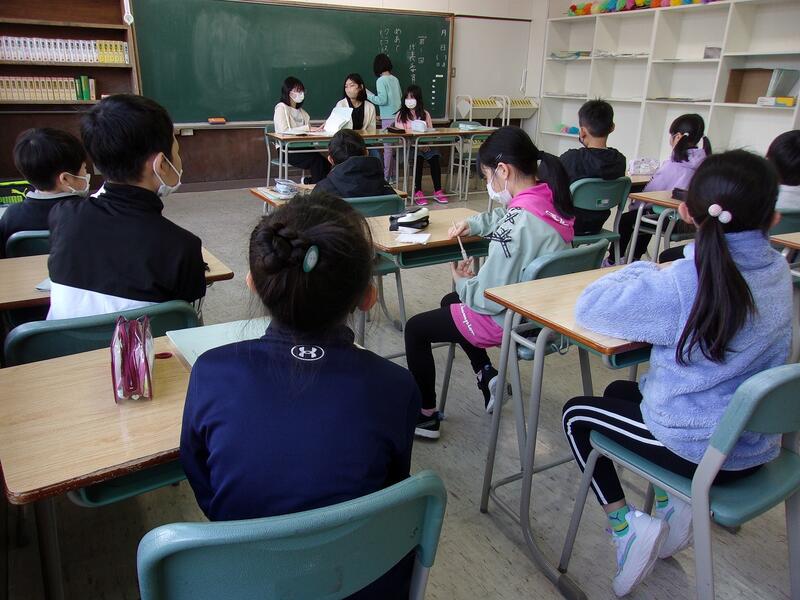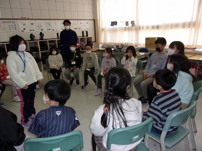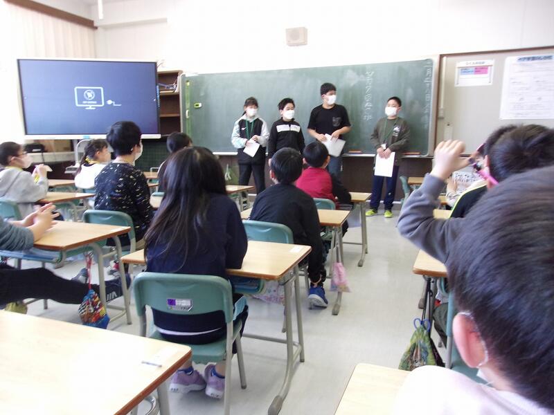 千歳市環境課の方々が講師となって「千歳市ゼロカーボン宣言」に向けて取り組めることを学びました。班でクイズの答えと理由を相談し、CO2を出さないようにするために何ができるかを考えました。お話を集中して聞く姿や自分たちの考えを発表する姿がとてもよかったです。今後は、学んだことを多くの人にどう伝えていくか実行する予定です。