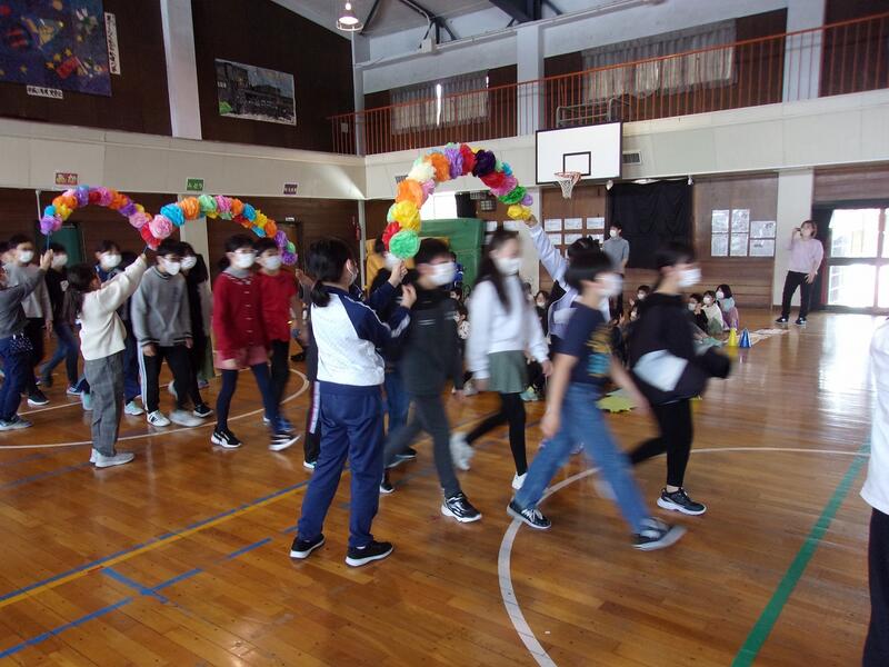 お別れ会前最後のなかよし遊びです。最初は関わりが少ない他学年との集まりで、緊張感や戸惑いなどが見られましたが、これまでの交流で少しずつ心の距離が近づき、今では、心から打ち解けて楽しむ姿が見られます。