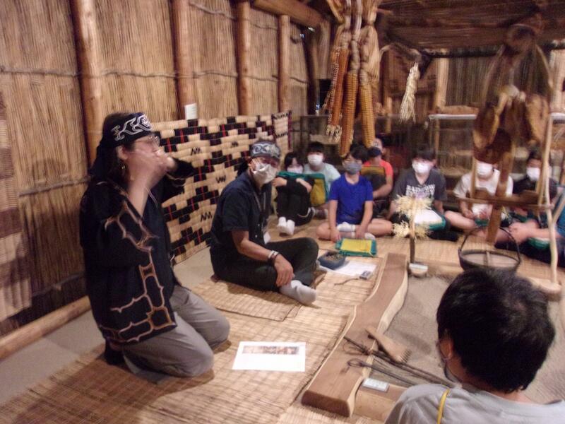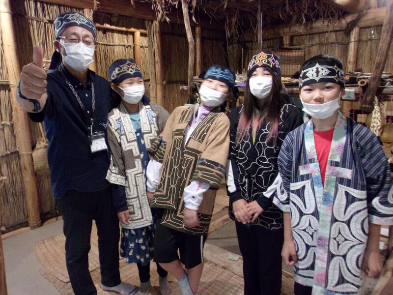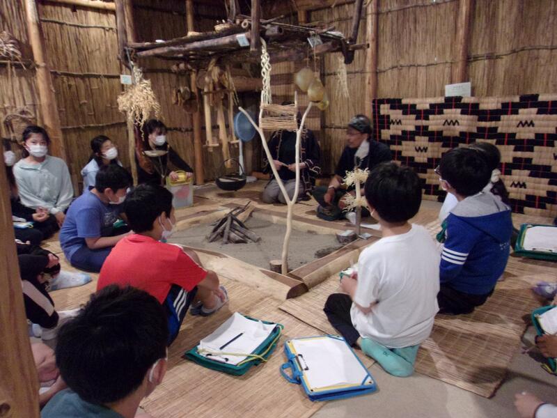 本日、5年生が末広小学校に行って、アイヌ文化について学習しました。末広小学校には、復元されたチセやいろいろな道具があり、本日は末広小学校の中原直彦先生と千歳アイヌ協会の上野亜由美さんに実際に説明をしてもらいながら、アイヌ語やアイヌ民族のくらし、楽器や模様などについて知識を深めることができました。夏休み明けの宿泊学習でウポポイ(民族共生象徴空間)を見学する5年生は、事前にアイヌ文化のことを知る、とても貴重な機会となりました。