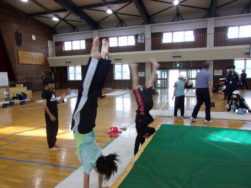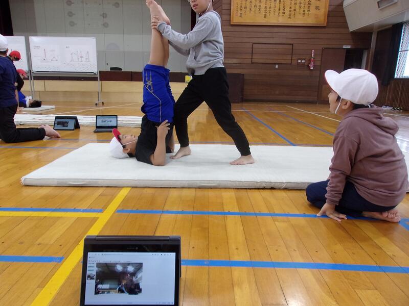 本日、石狩教育局義務教育指導班の中川指導主事、千歳市教育委員会指導係の野尻学校指導主事、北栄小学校の小学校体育エキスパート教員の久恒先生に参観していただき、5年生が体育の授業を行いました。学習内容はマット運動で課題は倒立でした。子供たちは、自分の目標に向かい、端末を使って自分の動きを確認したり、お手本の演技と見比べたり、友達とアドバイスをしあったりしながら、課題を解決しようと努力していました。マット運動が得意な子も、そうでない子も、頭と体をフルに使って学習していました。