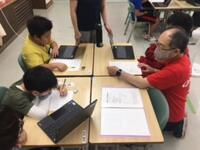 ひだまり学級2組の児童が、総合的な学習の時間「収穫祭をしよう」の単元で、教材園で収穫した野菜を使った料理の計画を立て、グループで話し合って作り方や調べたことをプリントにまとめる授業を行いました。焼き芋づくり、カレーチャーハンづくり、皮ピザづくりの三つのグループに分かれ、作り方を1人1台端末で調べ、プリントにまとめていきました。意見を活発に交わし、上級生が下級生に端末の使い方やまとめの仕方を教える場面もあり、この日の課題をやり遂げることができました。