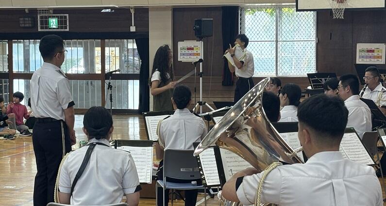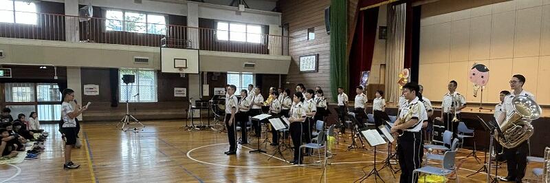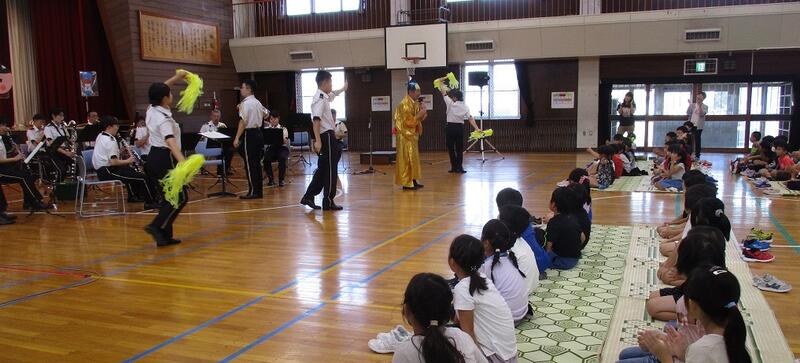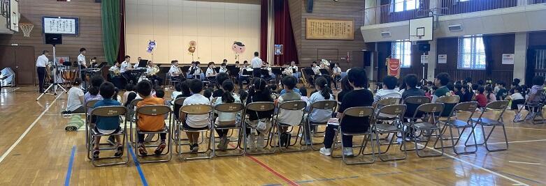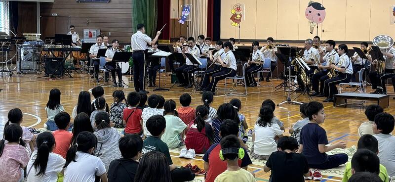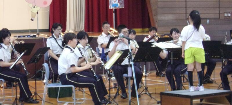 陸上自衛隊の第7音楽隊の方々による音楽鑑賞会を開催しました。隊員の皆さんの演奏は、子どもたちの心をひきつけ、真剣なまなざしで聴いていました。太鼓の音やシンバルの音は、床を伝わり振動が子どもたちの身体に伝わり、迫力を感じていました。知っている曲が多く発表してもらい、また、指揮者体験や演奏と子どもたちの踊りが一体となった場面があり、聴いているだけでなくて視覚的にも音楽の楽しさを体感することができ、子どもたちの心に残る鑑賞会となりました。第7音楽隊の皆様ありがとうございました。