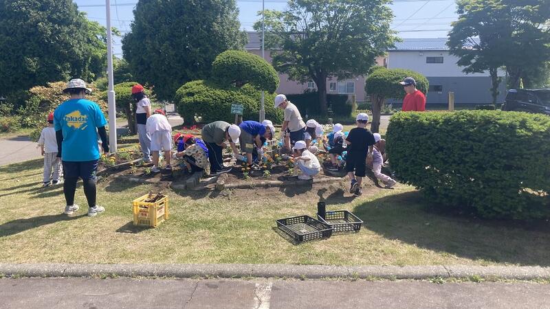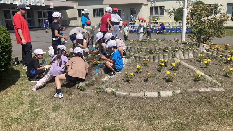 前庭花壇(児童玄関前花壇)に花苗の植え替えをしました。各学年が担当するエリアにマリーゴールドやアゲランタム、ペチュニア(白・ピンク・赤)の苗を植えました。1年生がマリーゴールの花苗を植え、すべての学年が植え替えを終えました。