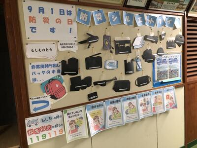 また、9月1日「防災の日」にちなみ、保健室前には「防災グッズ」について掲示されています。避難訓練をきっかけにして、ぜひご家庭でも防災について話題にしてほしいと思います。