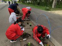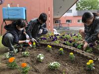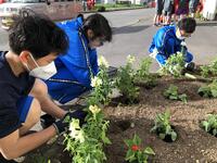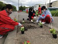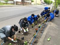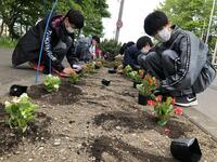 今年1回目の「プチボラ」を実施しました。全学年の有志生徒約170名の参加により、学校前道路と玄関前の花壇に花の苗植えを行いました。