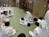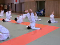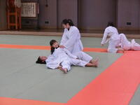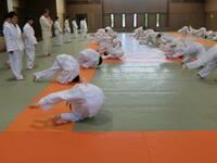 隣接する武道館をお借りして、柔道を行っています。前回り受け身などの受け身に取り組んだり、固め技をペアで行い、互いに逃れよう、逃すまいと、楽しみながら技を習得していました。