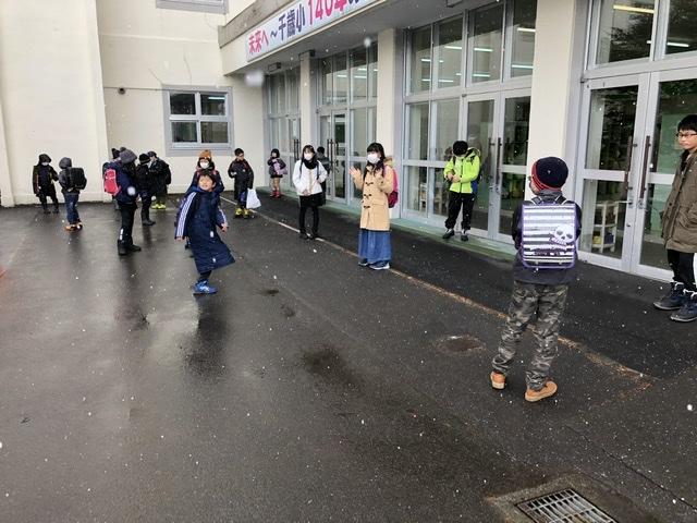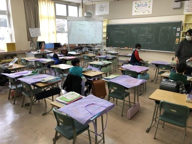 分散登校では、玄関前に間隔をとって整列、手洗い、アルコール消毒を行っています。