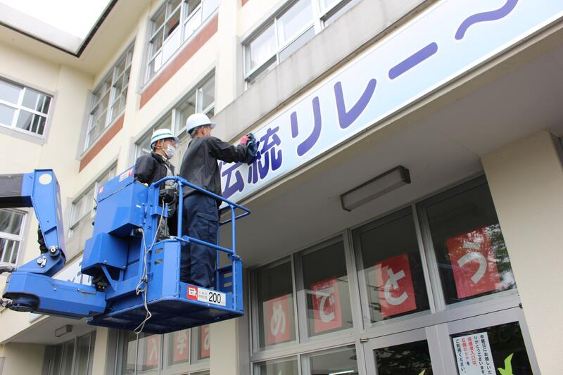 PTA会長様には重機も用意いただき看板の清掃をしていただきました。