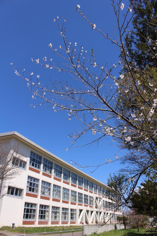 遅ればせながら、いよいよ本校にも桜の便りが届きました!雲一つない青空の中、とても綺麗に咲き始めています!