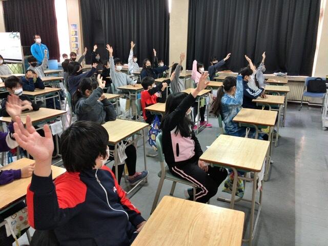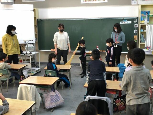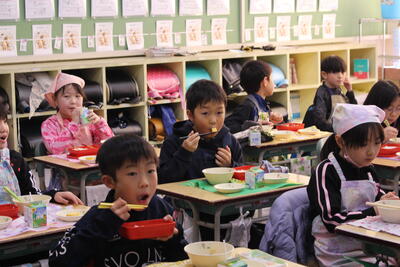 栄養教諭から給食ができるまでのDVDを見せてもらったり、大きなお玉などに触れたりして、子どもたちはさらに給食が好きになったようです。