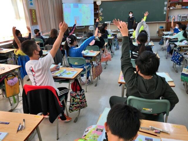 5年生は、日本の伝統文化を英語でどう言うのか、例えば「ねぶた祭り」は英語で「ねぶたフェスティバル」と表現することなどを学んでいました。