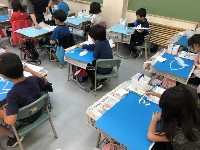 1年生は白い絵の具を使って、お話の絵をつくっていました。