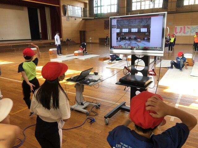 子どもたちは、自分の跳ぶ様子に興味深く見入っていました。