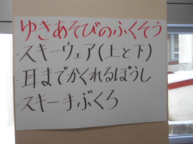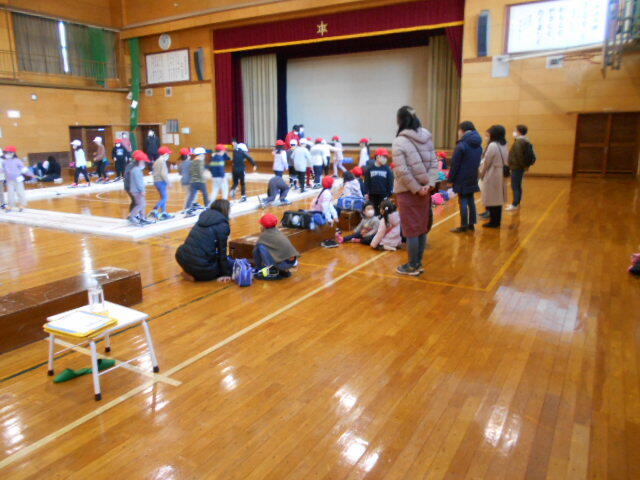 体育館でスケート靴をはく練習と、歩く練習をしました。