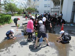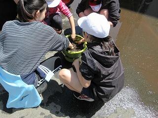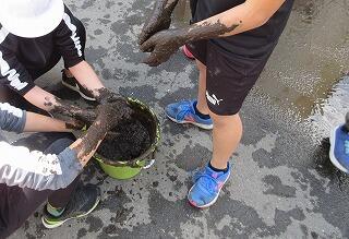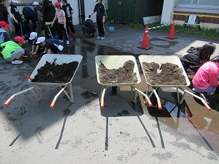 5年生の社会科授業で「バケツ稲」を行いました。「バケツ稲」とは、バケツの中に田んぼを作って、その発育を観察する学習です。みんな泥んこになって、楽しく学習に取り組んでいました。