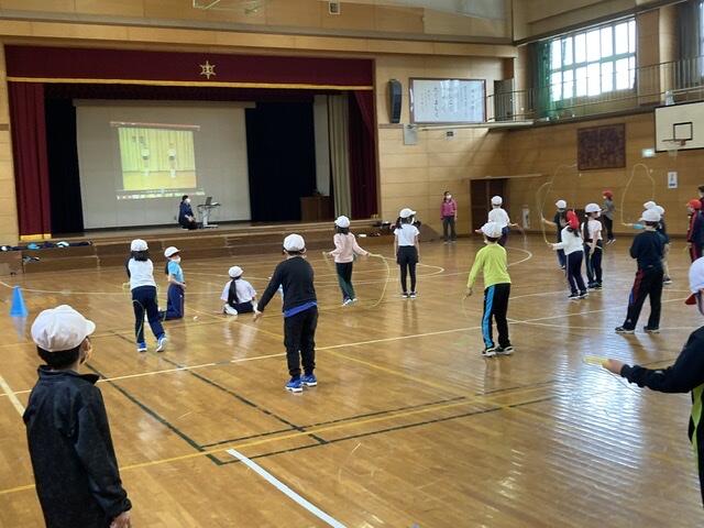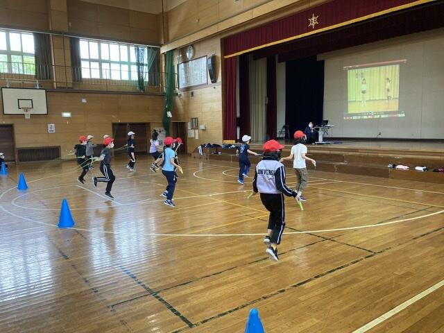 今日は雨模様だったので、3年生は体育館で縄跳びを久しぶりに行いました。