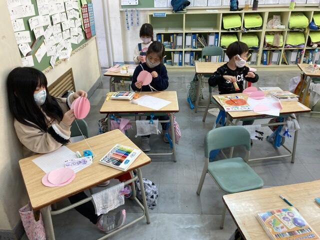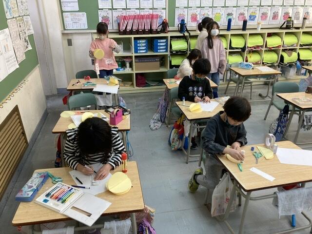 1年生は、卒業式に向けた廊下の飾りづくりを行っていました。