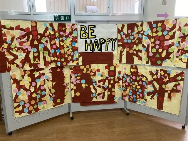 仲よし会の取り組みである「あいさつの木」が完成し、1階ホールに掲示されています。