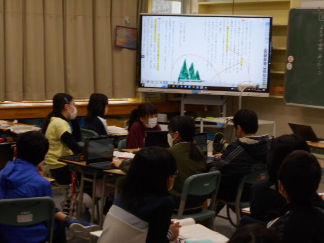 4年生国語の交流場面 投稿日時 : 2023/03/13 編集長 カテゴリ: 現在、日本の学校では、 「個別最適な学び」と「協働的な学び」の 一体化をすすめています。 交流の場面では一人一台端末も利用しながら 授業をすすめています。