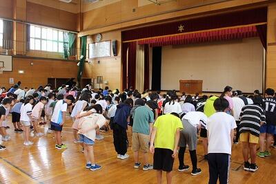 本日、夏休み集会が行われました。明日から始まる夏休みに向けて、学校長から、「めあてをもって長い休みを過ごすこと」、「交通事故や水の事故に遭わないよう十分気を付けること」についての話がありました。楽しく、そして有意義な夏休みを送って欲しいと思います。