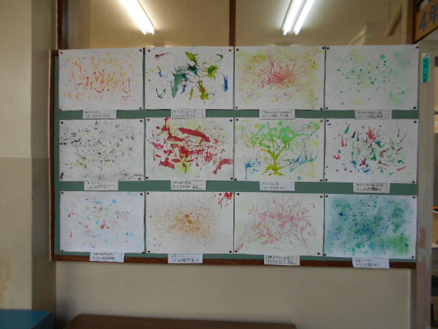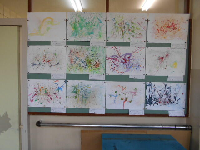 4年生図工 絵の具でゆめもよう 投稿日時 : 2022/06/16 編集長 カテゴリ: 画用紙の上で、絵の具で着色した水を落とし、 紙を傾けたり息を吹きかけたりして、 自分だけのその時の瞬間の模様を 創り出します。 どの作品も創造性にあふれていて楽しいです。