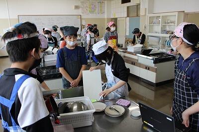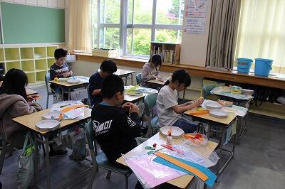 各学年とも運動会練習が本格化しています。今日の5時間目は1・2年生が合同で玉入れやリレーの練習をしていました。また、運動会練習と並行して教科の授業も頑張っています。写真は、4年生図工・6年生調理実習の様子です。