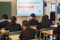 日常的に家庭科で学習している事項を整理・確認しながら、最後はお弁当作りのメニューを考えるというものでした。バランス良いお弁当となるよう、試行錯誤している姿がありました。